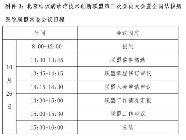 2.联盟代表原则全程参加10月27日的“结核病医院院长论坛”暨“北京结核病诊疗技术创新联盟/全国结核病医院联盟年度工作会议”,具体内容详见相应通知。
